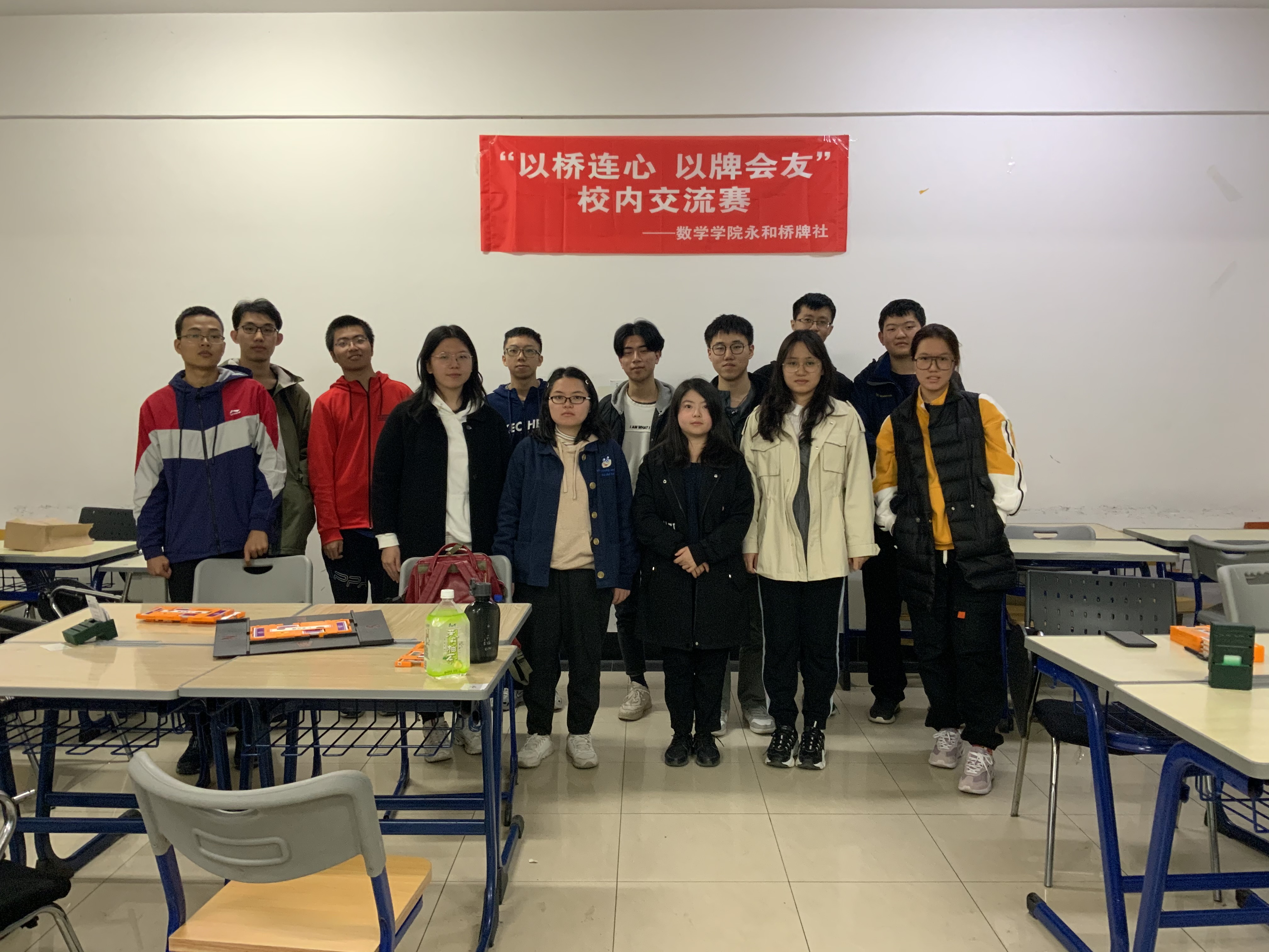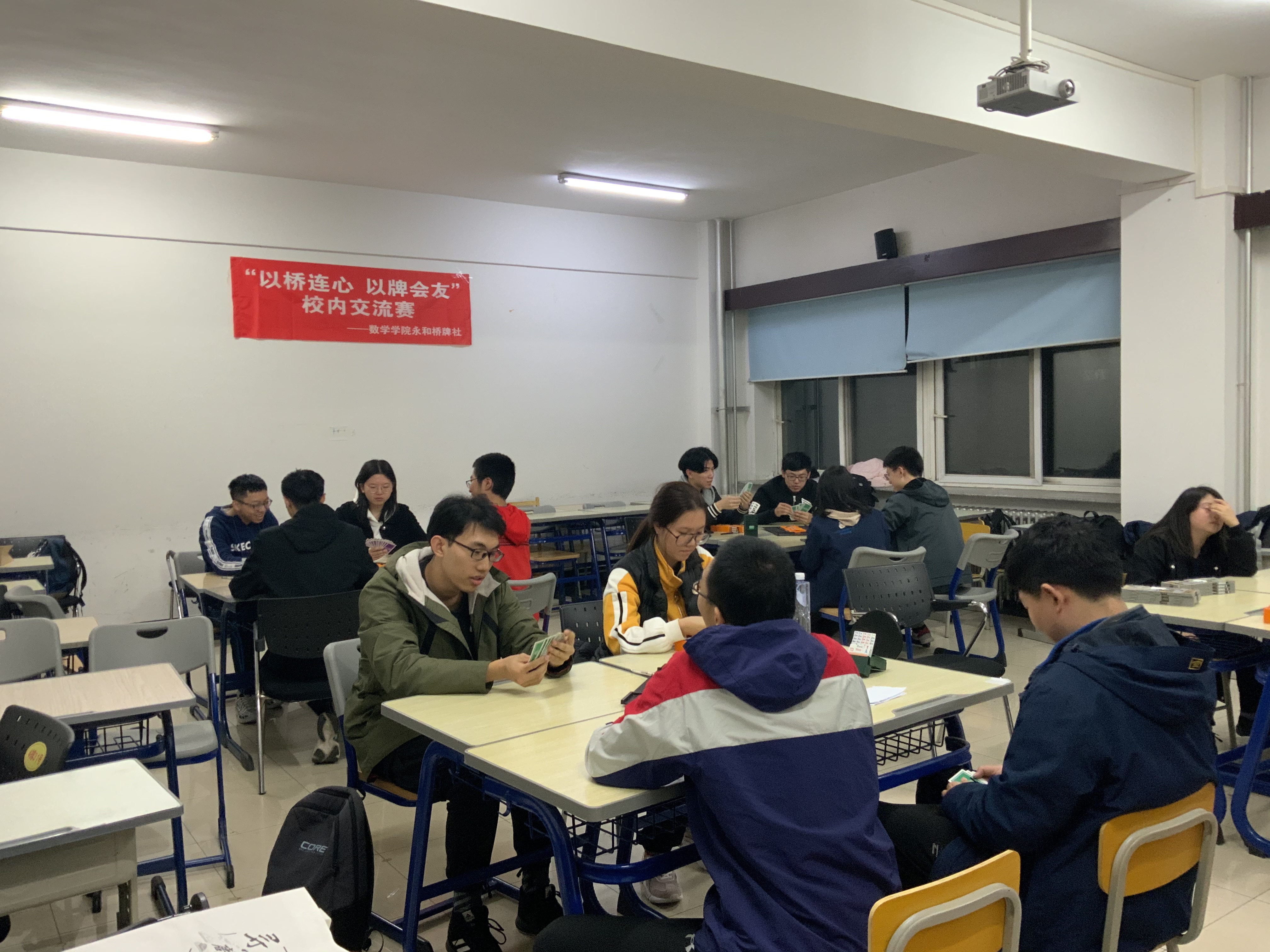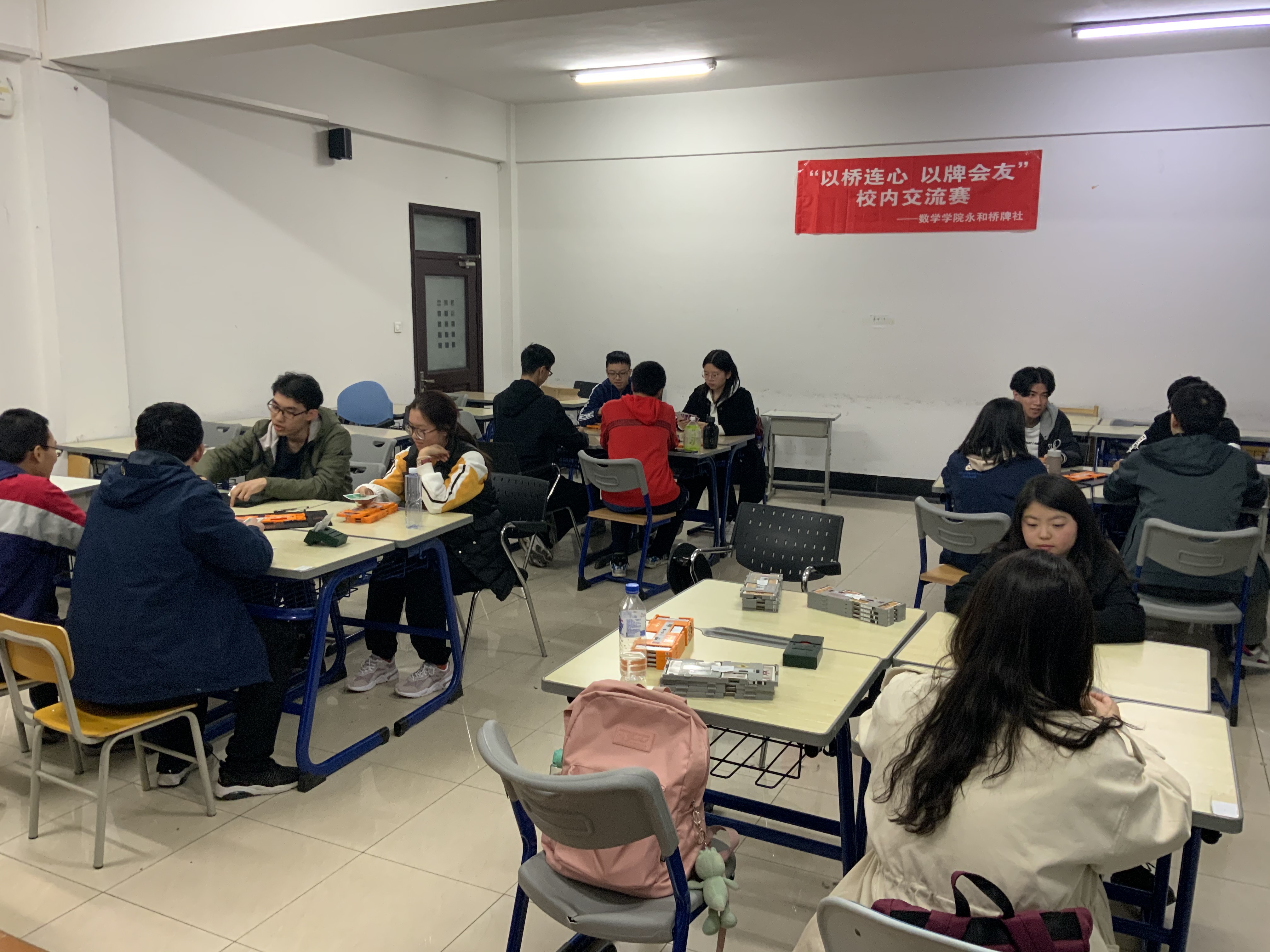 1017日下午1:30,bb贝博艾弗森官方网站永和桥牌社在经信教学楼A105教室举办了“以桥连心 以牌会友”校内交流赛,其中,参赛选手不乏来自我院的本科生、硕博研究生及其他学院的桥牌爱好者。此次比赛采用计分制,共制24副牌,七组队伍打完24副牌后比较最终得分,分高的队伍获胜。
