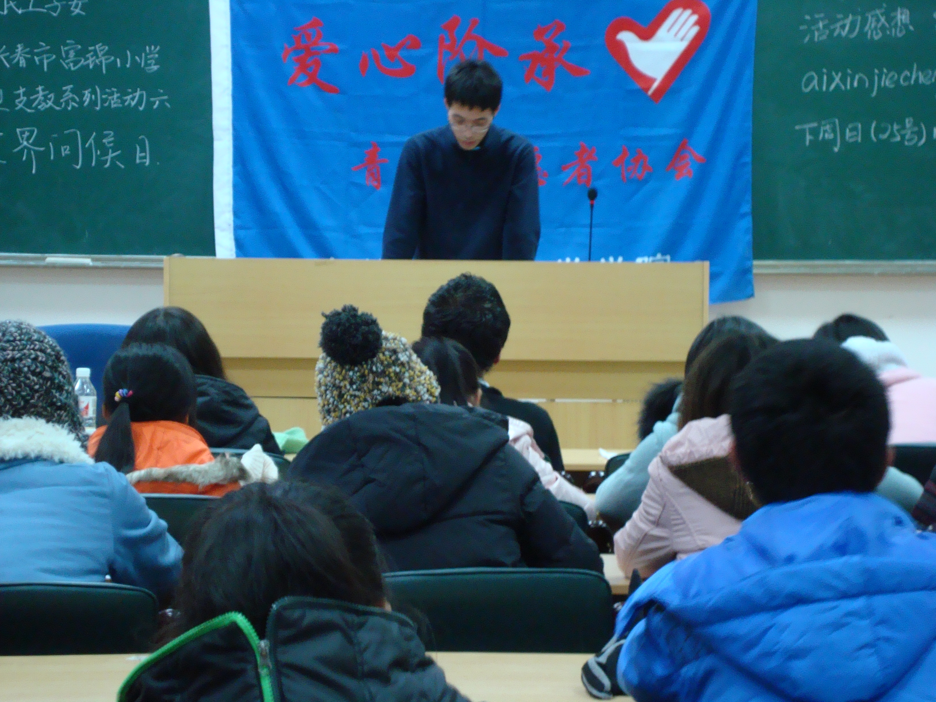 2012年11月15日晚6点,bb贝博艾弗森官方网站爱心阶承青年志愿者协会在数学楼一楼报告厅举办了“走进长春市富锦小学--大型支教活动”系列之第六届“世界问候日”主题活动的志愿者培训。