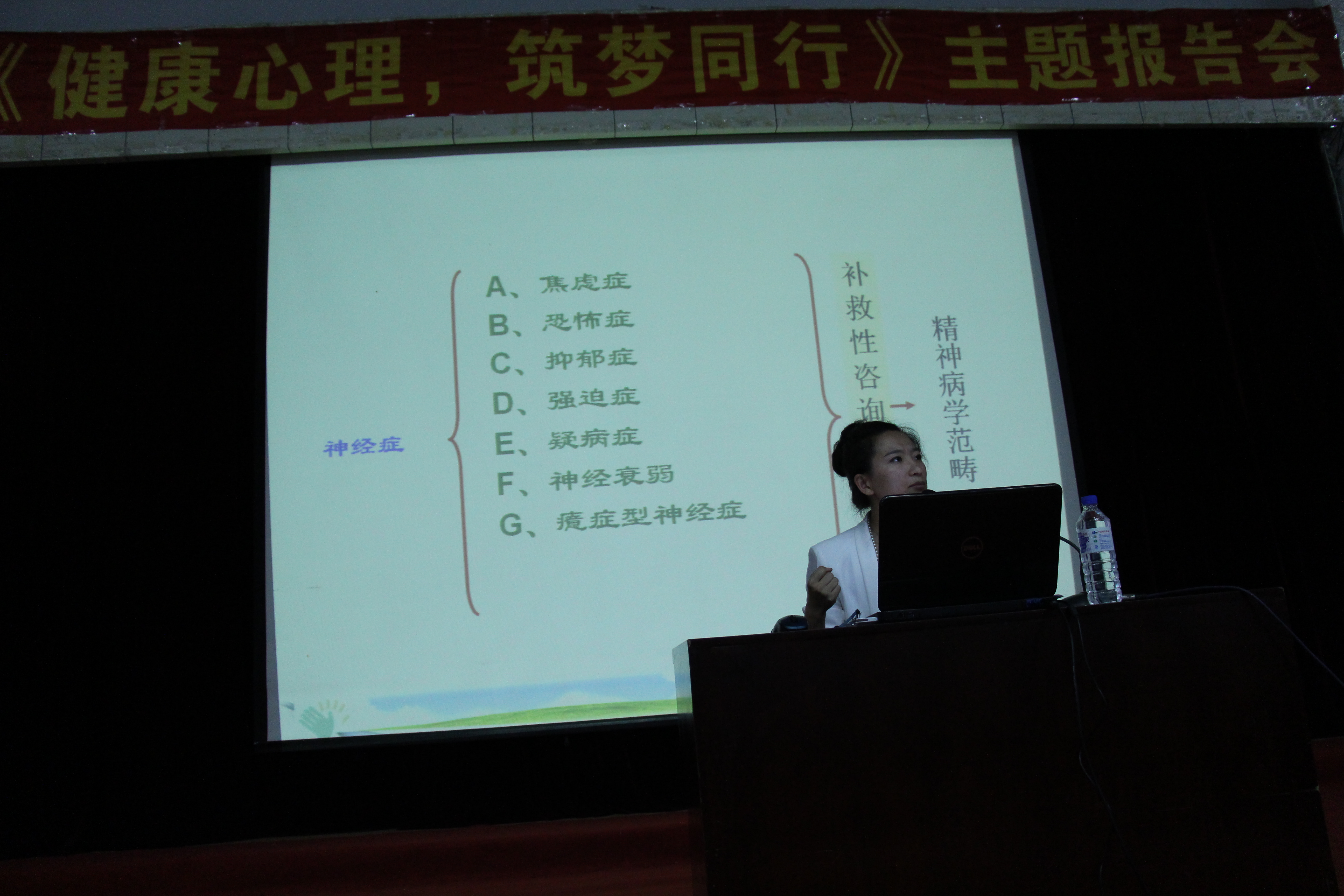 此次主题报告会由左振鹏老师主讲,左振鹏老师已经从事学生心理健康教育10年之久,她开场就用我们理学部经常接触到的数字来调动学生的积极性,整场报告会中更是以诙谐幽默的语言对心理健康方面的一些疾病分类和症状等等进行了较为细致的讲解,尤其针对大学生可能遇到的心理问题,以及如何帮助自己或他人解决心理问题等等进行了更为详细的介绍。整场活动中她还多次与同学们形成互动,都引起了同学们积极地反响。