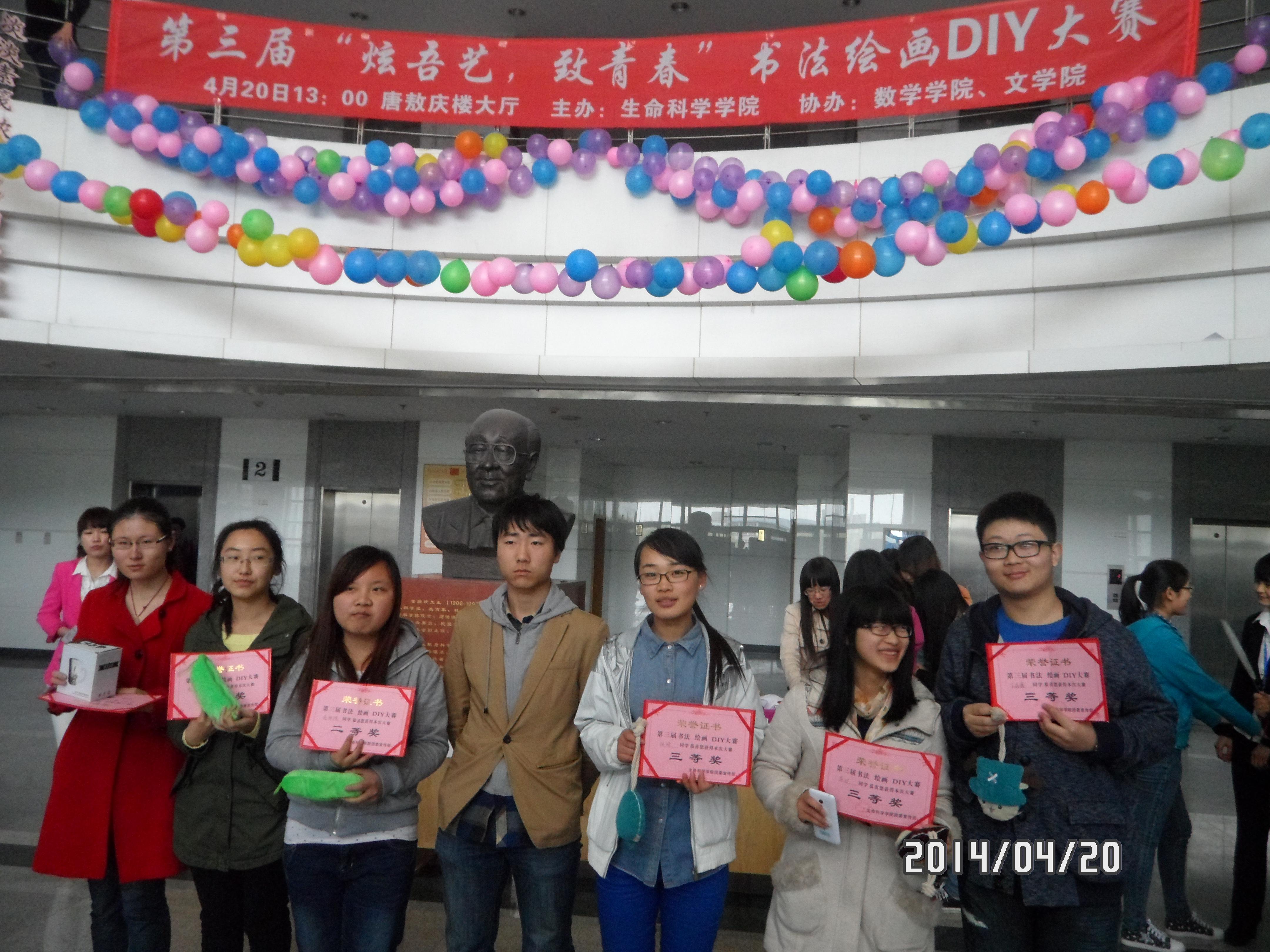 4月20日下午1:00主题为“炫吾艺,致青春”的第四届书法绘画DIY创意大赛在唐敖庆楼大厅隆重举行。本次活动由生命科学学院,bb贝博艾弗森官方网站和文学院三个学院的团委宣传部联合举办,有数十名同学参加,同场竞技。