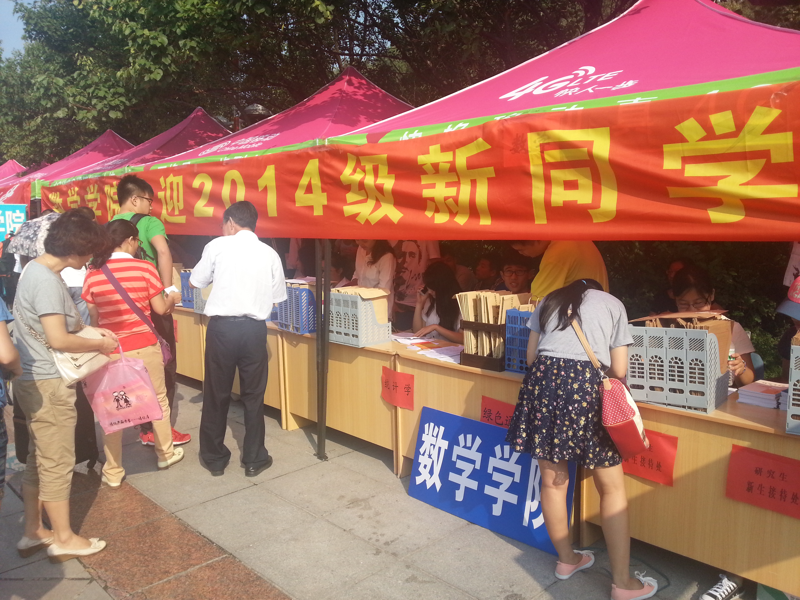 热情的志愿者在新生一下车时就迎上前去,帮忙引路、提行李,一路上给他们介绍着学校的“风土人情”。在迎新点领取新生材料袋、登记,志愿者全程服务,帮助新生顺利入住宿舍。学院临时为家长搭建的休息区,一路陪送的志愿者,为家长和同学讲解学校的各种情况,无不体现着数学学子的体贴与周到。