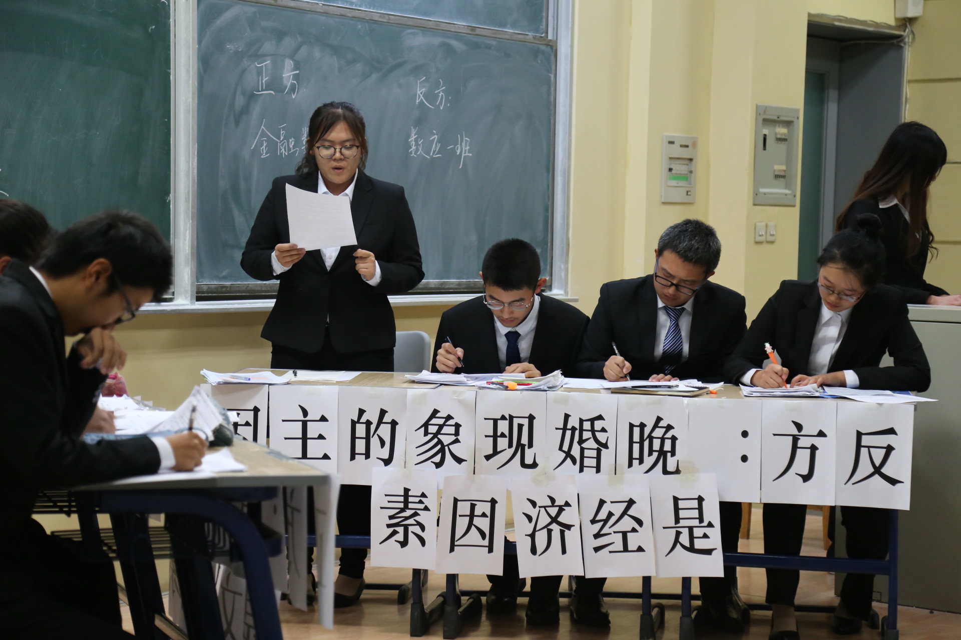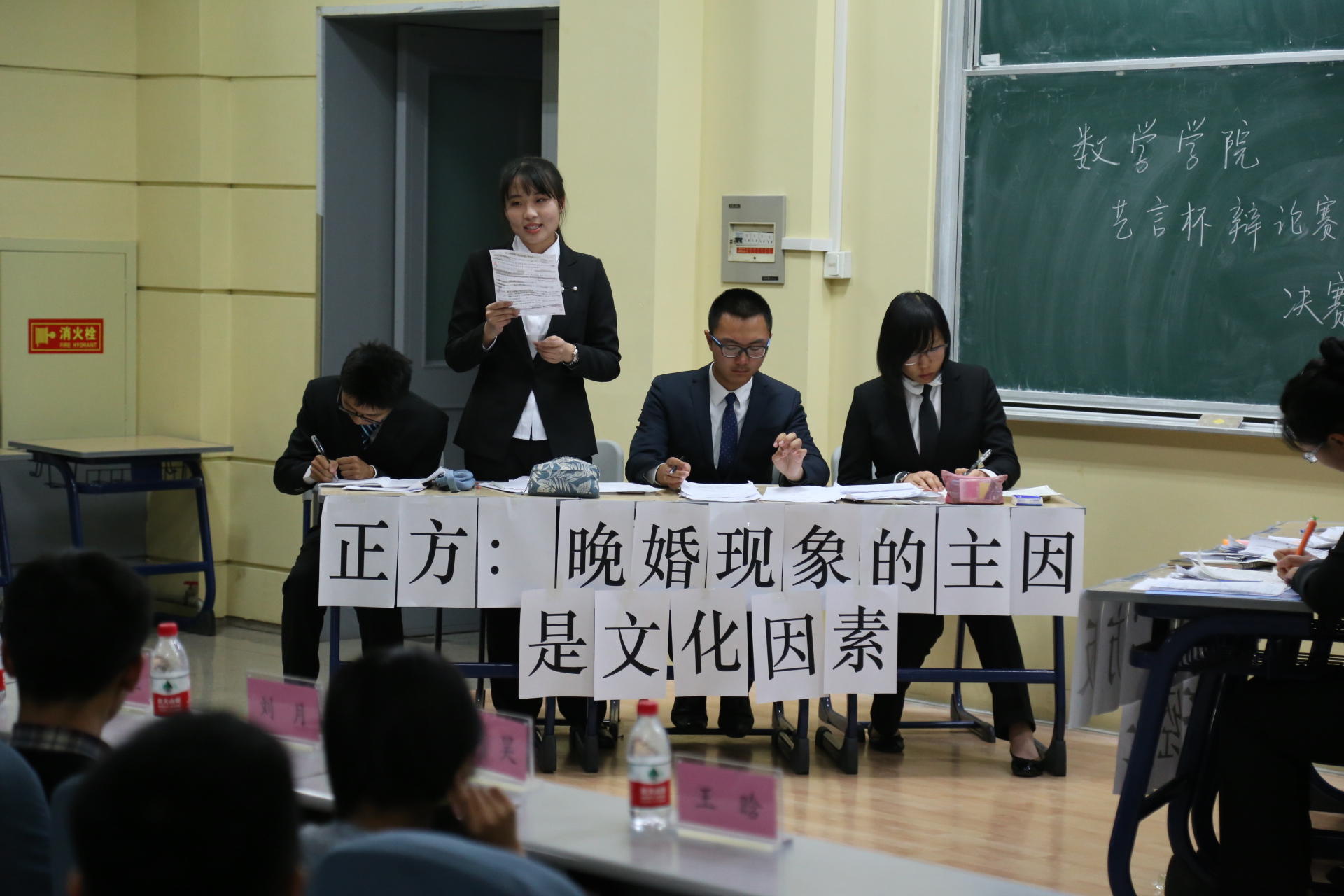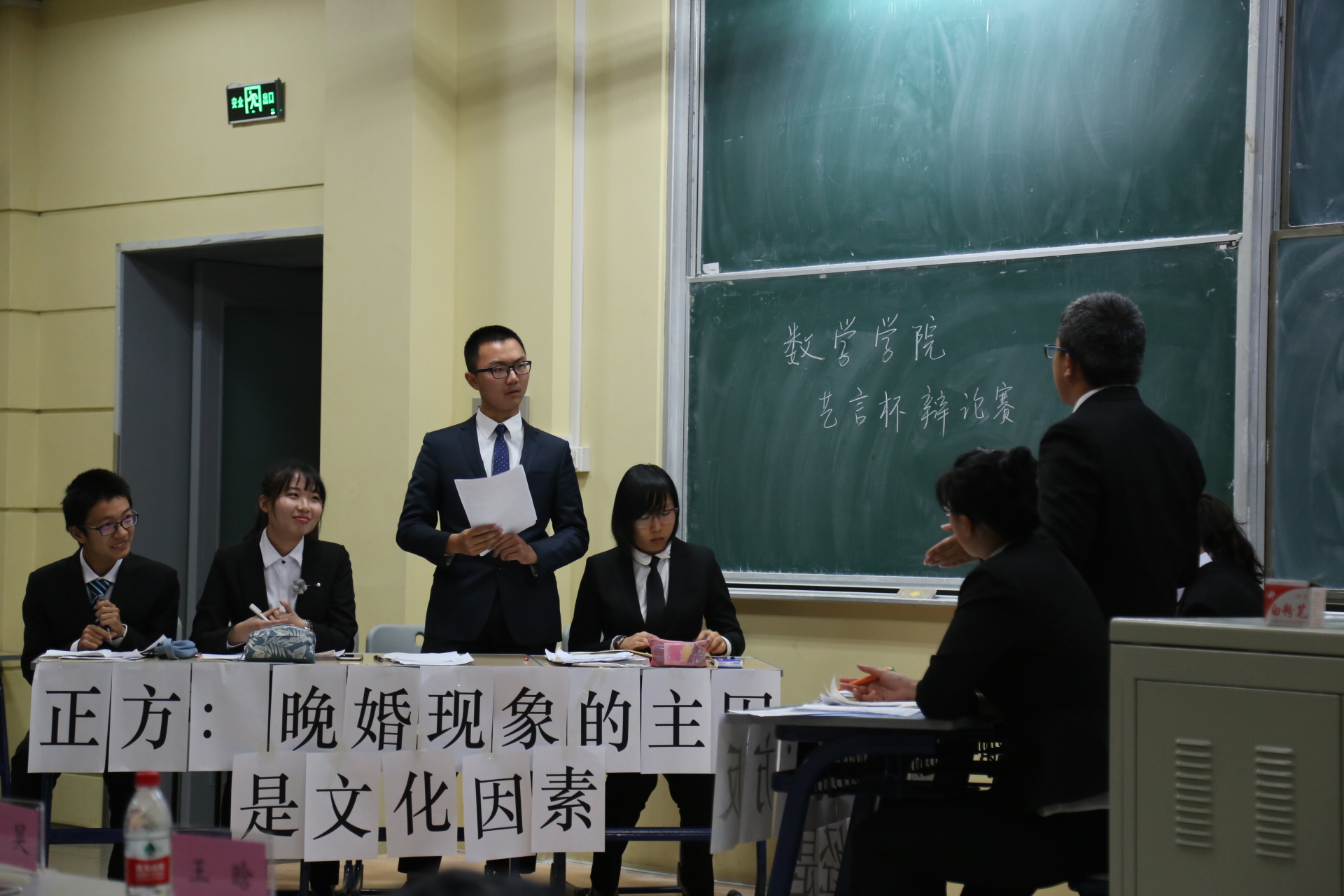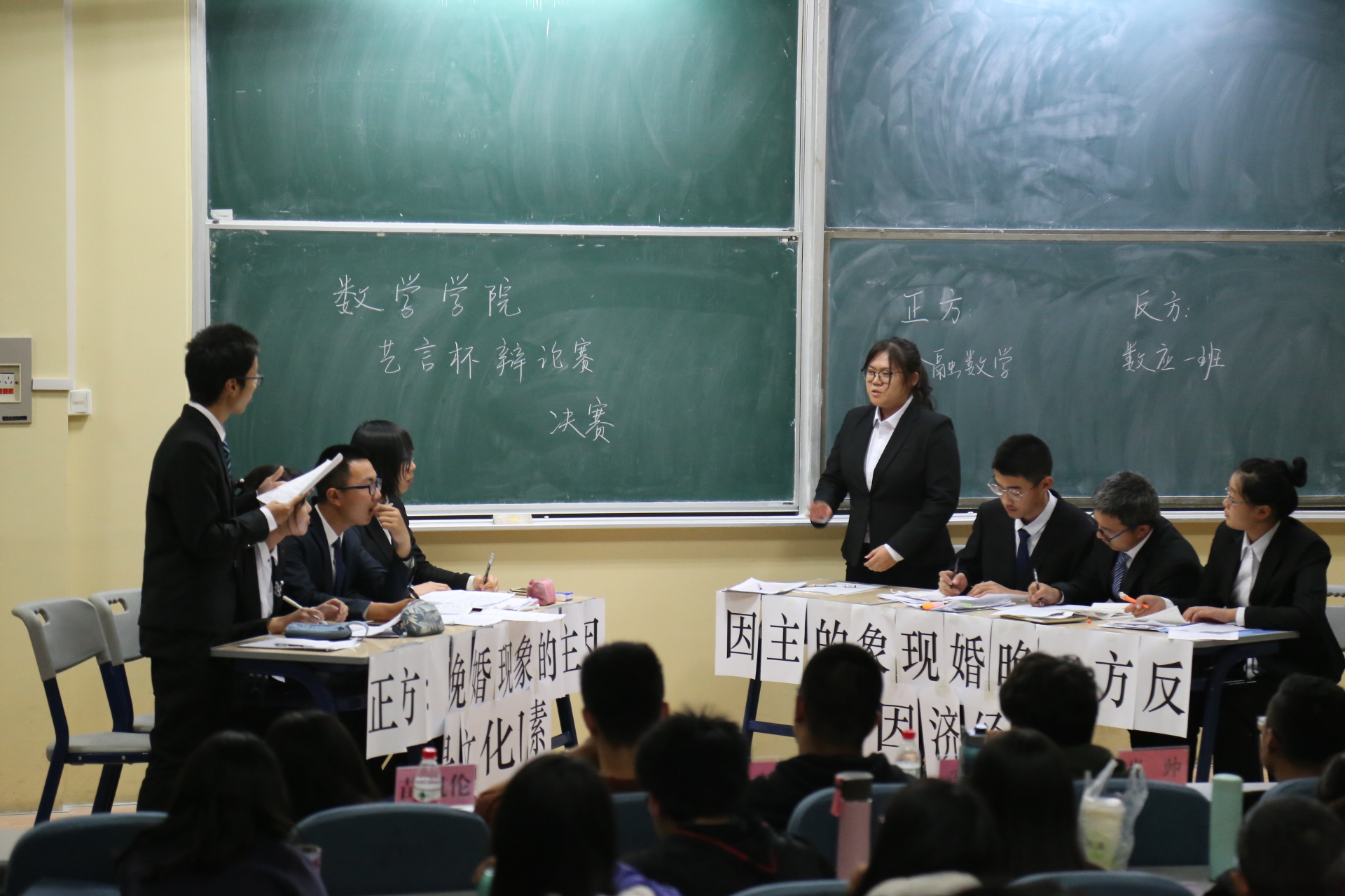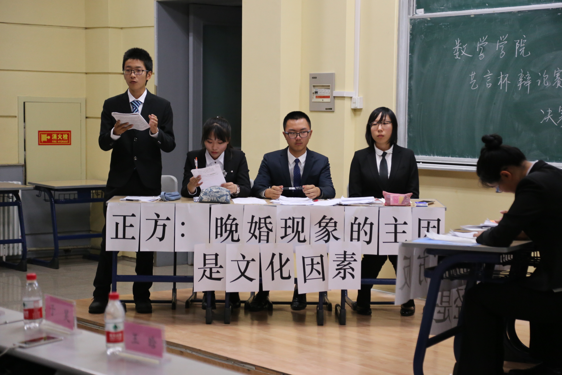比赛刚开始,正方就经济和文化,到底哪个是导致晚婚现象的主因提出了晚婚现象的主因是文化因素的观点,并将影响人们做出晚婚选择的文化分为了物质文化,制度文化和心理文化三大类。他们认为:真正能左右人们选择晚婚的,是制度文化;能让人们心甘去晚婚的,是心理文化;让人们有条件晚婚的,是物质文化。从而论证其观点文化才是晚婚现象的主要因素。