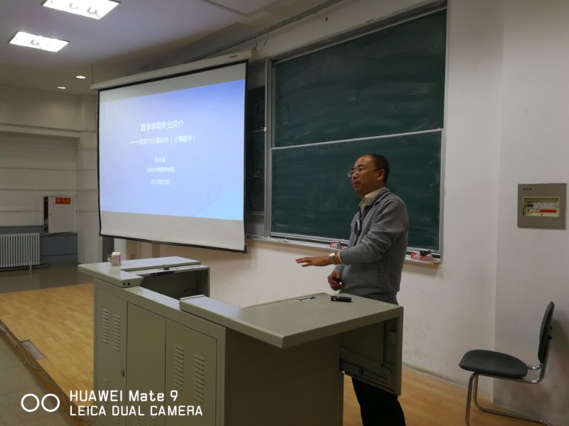 此次介绍大会由王德辉教授主持。首先,由计算数学系主任李永海教授介绍信息与计算科学专业,此专业最初为国家二级学科,两次被评为国家二级一流学科,随着大数学的发展,被评为国家一级学科。而今它的主干课程有数学分析、高等代数、空间解析几何、实变函数等,李永海教授也为我们介绍了相应学科的带头人,阵容十分强悍。随后,概率统计与数据科学系朱复康教授介绍了统计学相关知识,他称统计学不止是学科学,也学艺术。在定义之后,介绍了统计学门下的各个特色学科及其带头人,具体有应用概率论、大数据分析、数理统计、生物与医学统计等。最后还介绍了统计学与金融统计的内在联系。紧接着,应用数学系主任王春朋教授介绍的了数学与应用数学专业,此专业是bb贝博艾弗森官方网站特色专业之一,今年也入选了双一流专业。王春朋教授先向大家介绍了数学与应用数学的教材建设,之后重点介绍了其研究方向及学科带头人,具体有动力系统,偏微分方程、泛函分析、代数、拓扑,控制及运算。