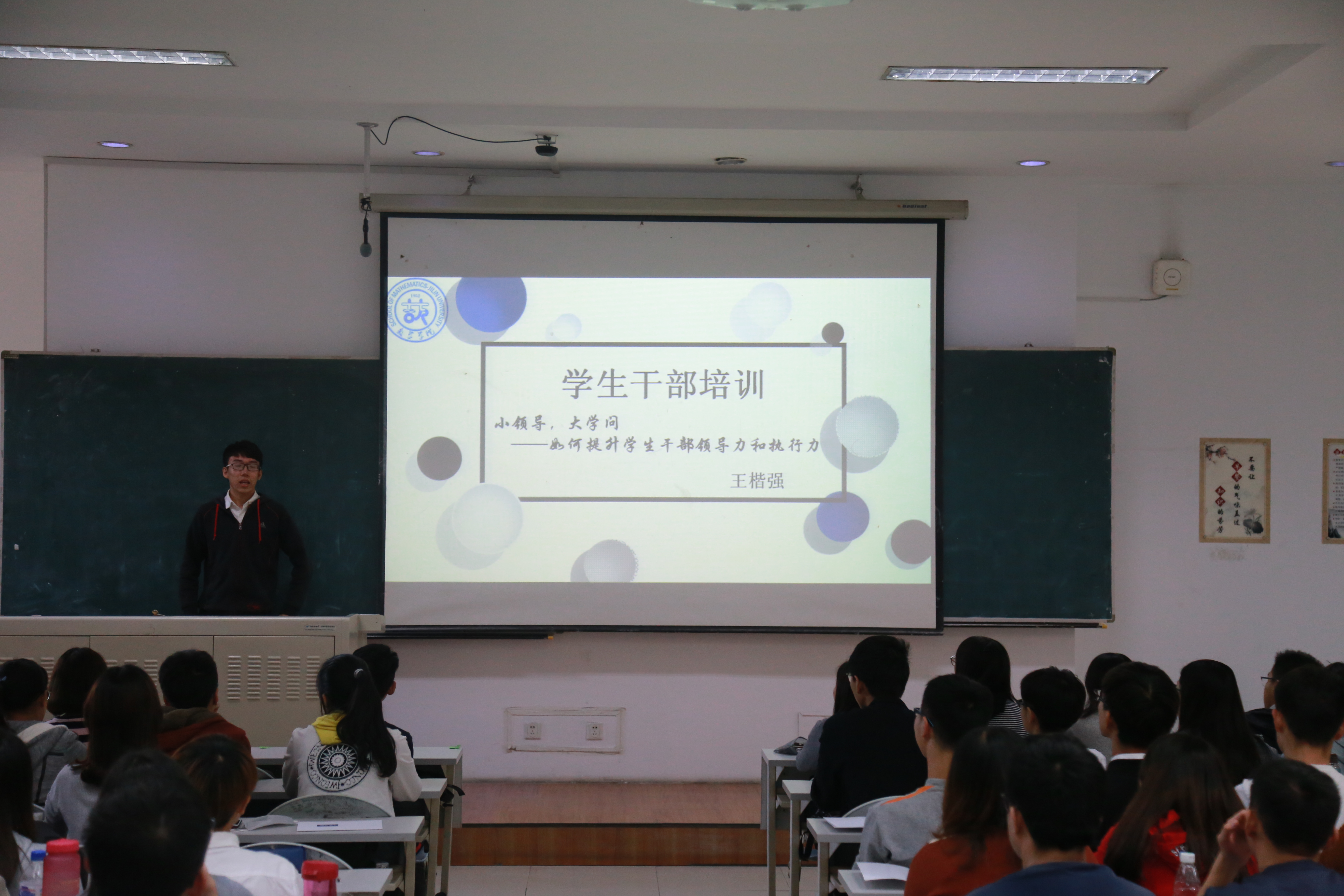 第一堂课“小领导,大学问--提升学生干部领导力和执行力” 由学生会副主席王楷强主讲。王楷强首先让大家思考了一个问题:为什么要加入学生组织做学生干部?只有将这个问题思考清楚,才能定位好自己在部门中的角色。他认为做学生工作最重要的是热爱和责任,是用心投入。接下来,他从说话举止礼貌得体、熟练运用办公软件、加强组织沟通能力、提高个人学习成绩四个方面讲述了如何提升个人素质。其中,他提到工作时态度积极、认真细心、拒绝拖延等良好的行为习惯会带来高效率和高质量,起到事半功倍的效果。王楷强举了很多自己的实例来告诉17级的学生干部,作为各学生组织的副部长,一是要起到模范带头作用,二是要学会合理规划安排工作,三是要端正态度敬畏规则。最后,王楷强补充了举办活动时报账工作的具体流程,希望各部门之间能够相互配合,提高效率,不做重复性工作。