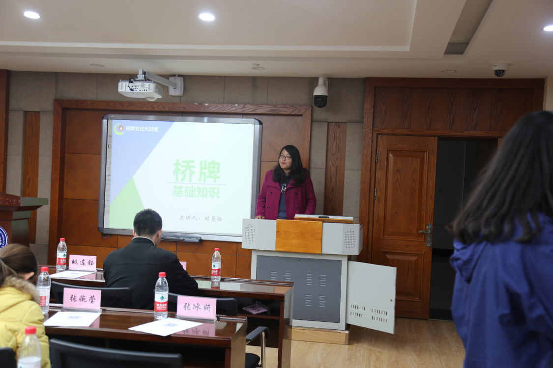 首先,由永和桥牌社社长李子钰同学为我们简单的介绍了桥牌是什么,桥牌为什么受欢迎,玩桥牌的好处以及桥牌在吉大的发展等等。同时,李子钰同学与台下同学们提问互动,台下同学们积极回答问题。然后,由bb贝博艾弗森官方网站团委副书记兼社团联合会主席赵雯晗为吉林省桥牌协会颁发特殊贡献单位奖,学生会主席邱韵为长春市桥牌协会颁发特殊贡献单位奖,由团委副书记李潇琦为刘曼怡颁发特殊贡献个人奖。再接着,资深桥牌达人刘曼怡为我们讲解了基础桥牌知识,桥牌到底该怎么玩。刘曼怡为我们到场的每个人都布置了在线桥牌练习,大家也都纷纷拿起手机下载app,然后开始试玩。刘曼怡带着台下的同学们分析每个练习的出牌策略,让我们从对桥牌的一无所知到成为入门新手。