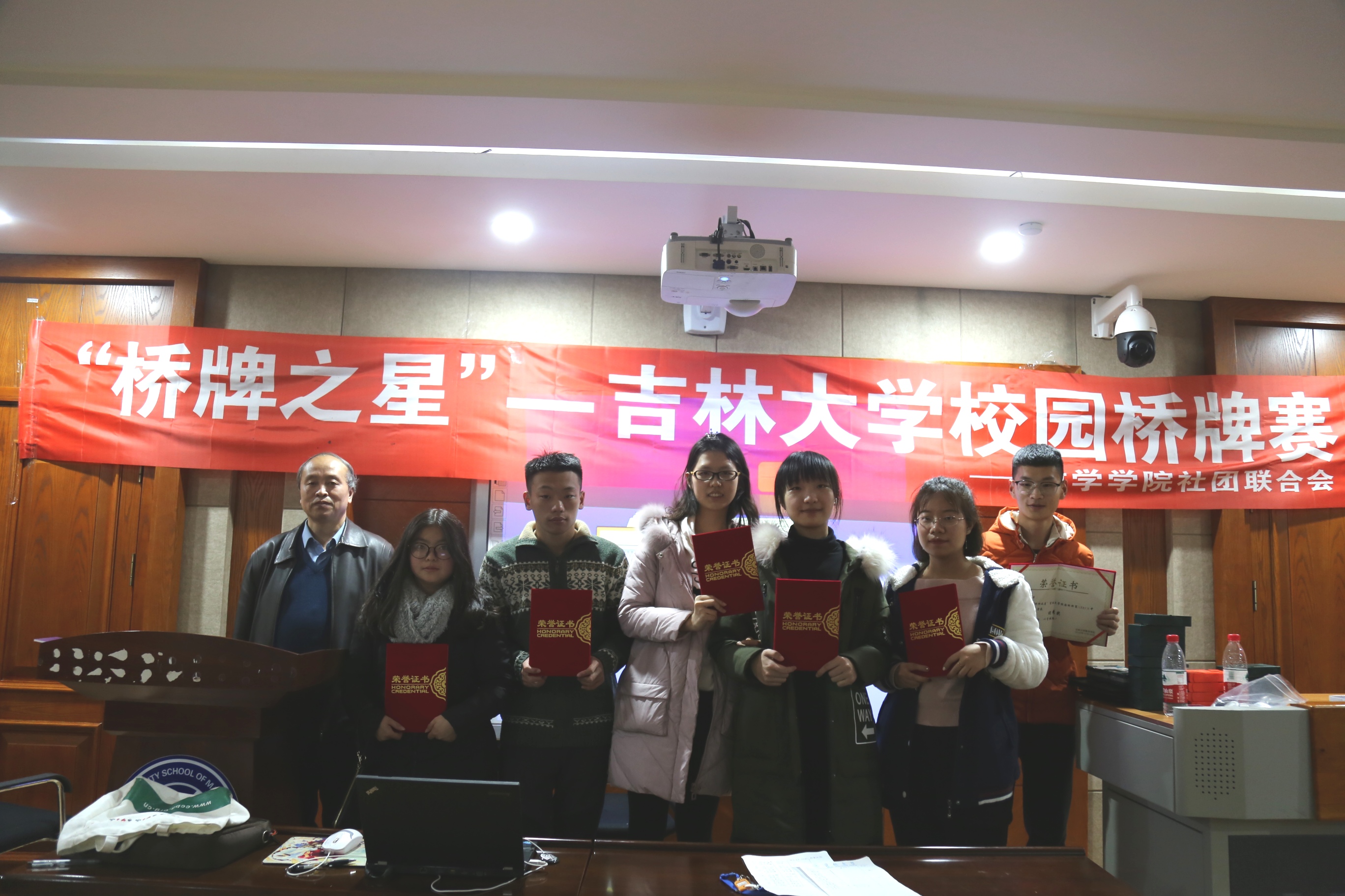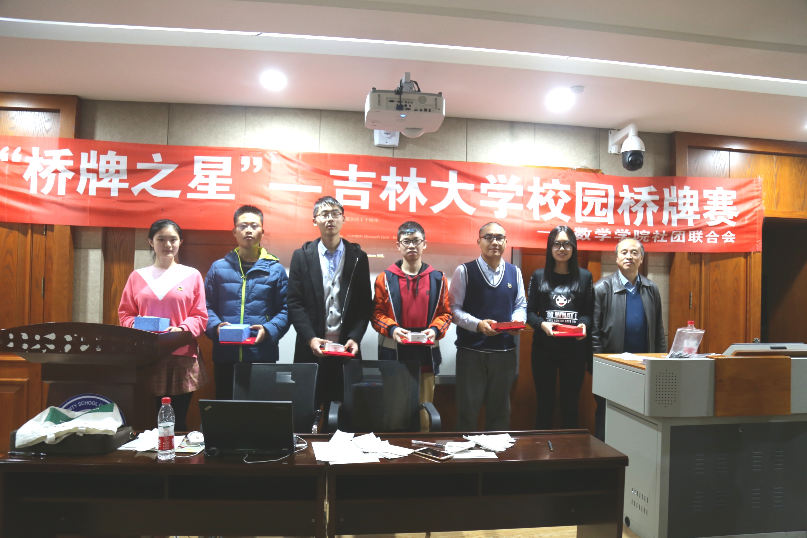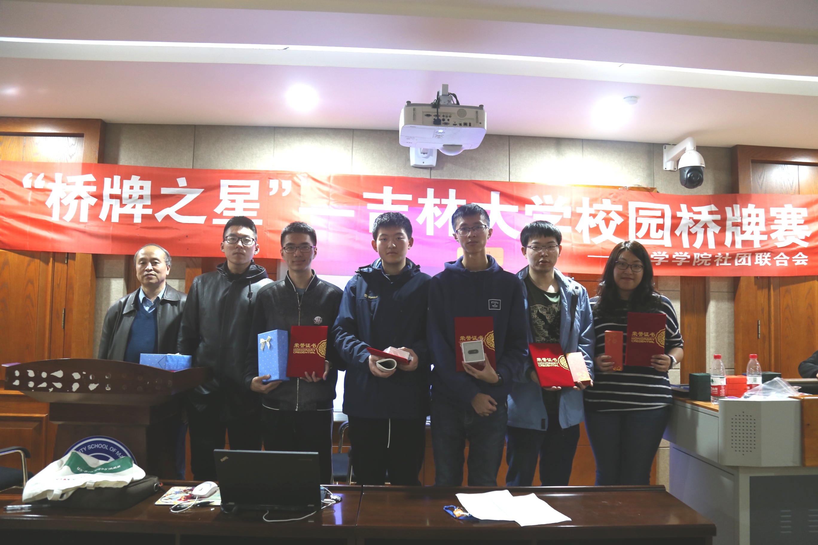 经过将近四个小时的激烈角逐,比赛结束。裁判裁决胜负后,由评委长春市桥牌协会副主席姚连钰为获胜者颁发礼品,为参赛者颁发证书。“牛刀小试组”一等奖由吴林浩同学,彭颜德同学获得,“大显身手组”一等奖由刘溯,王志铭同学获得。