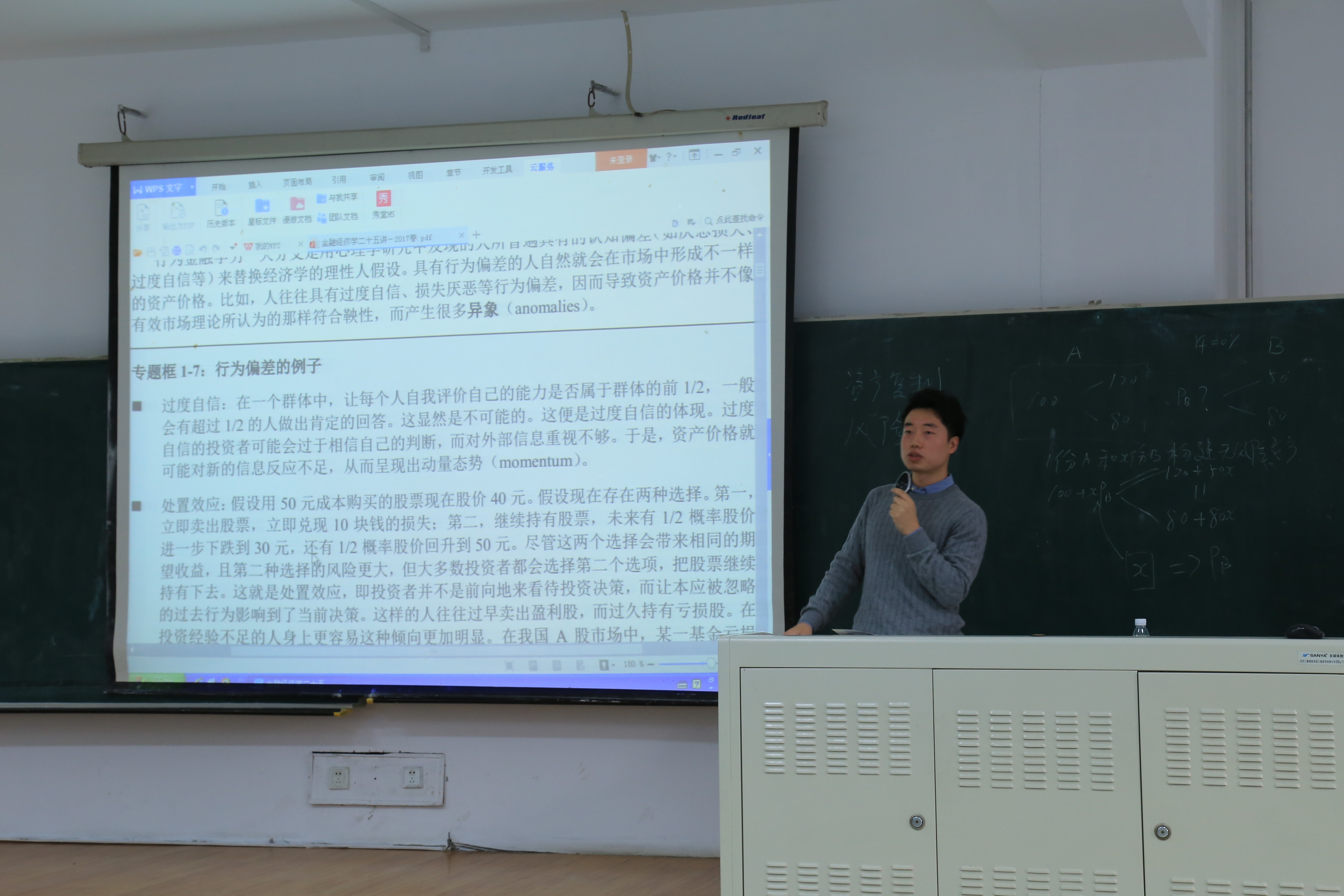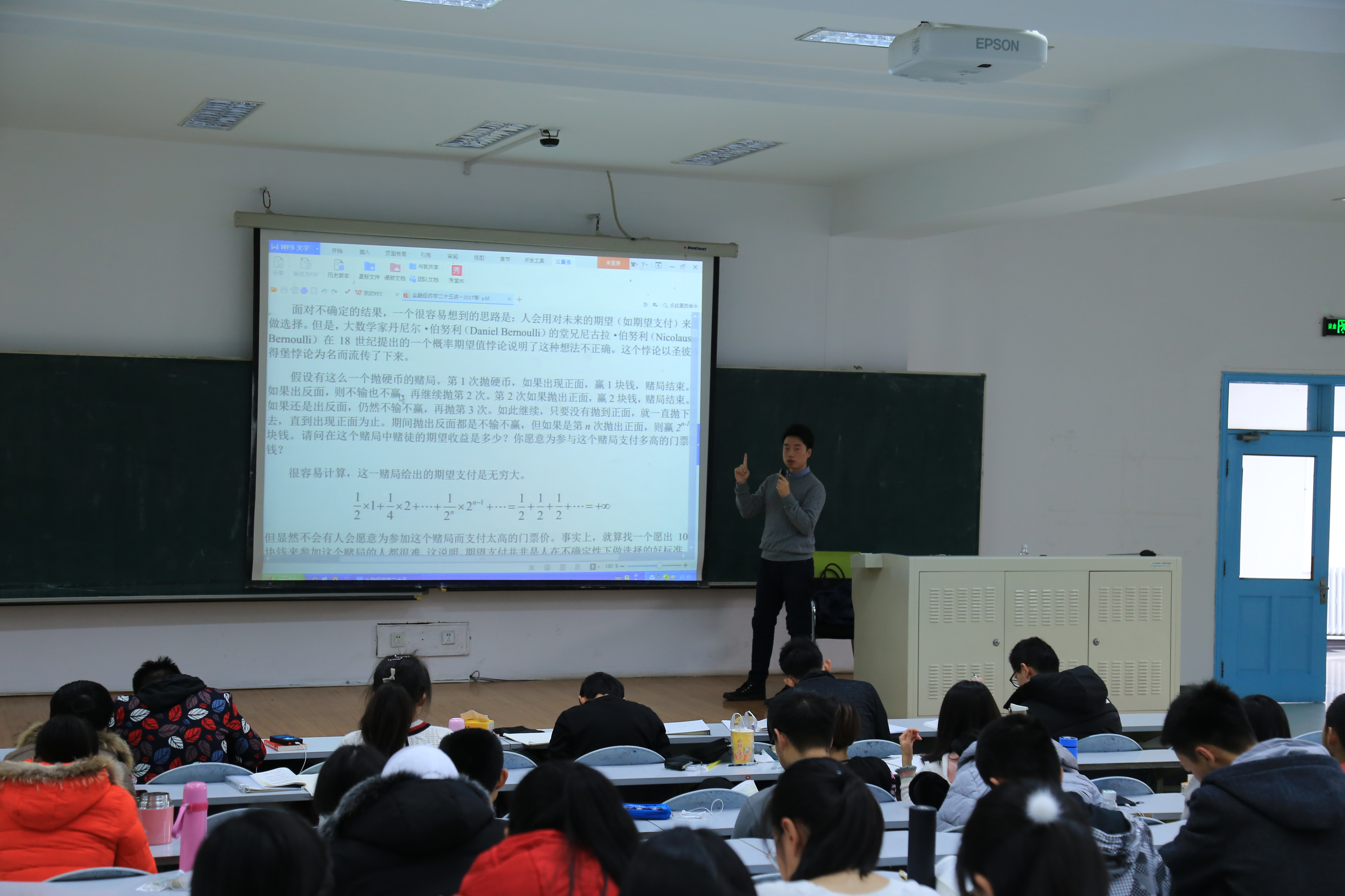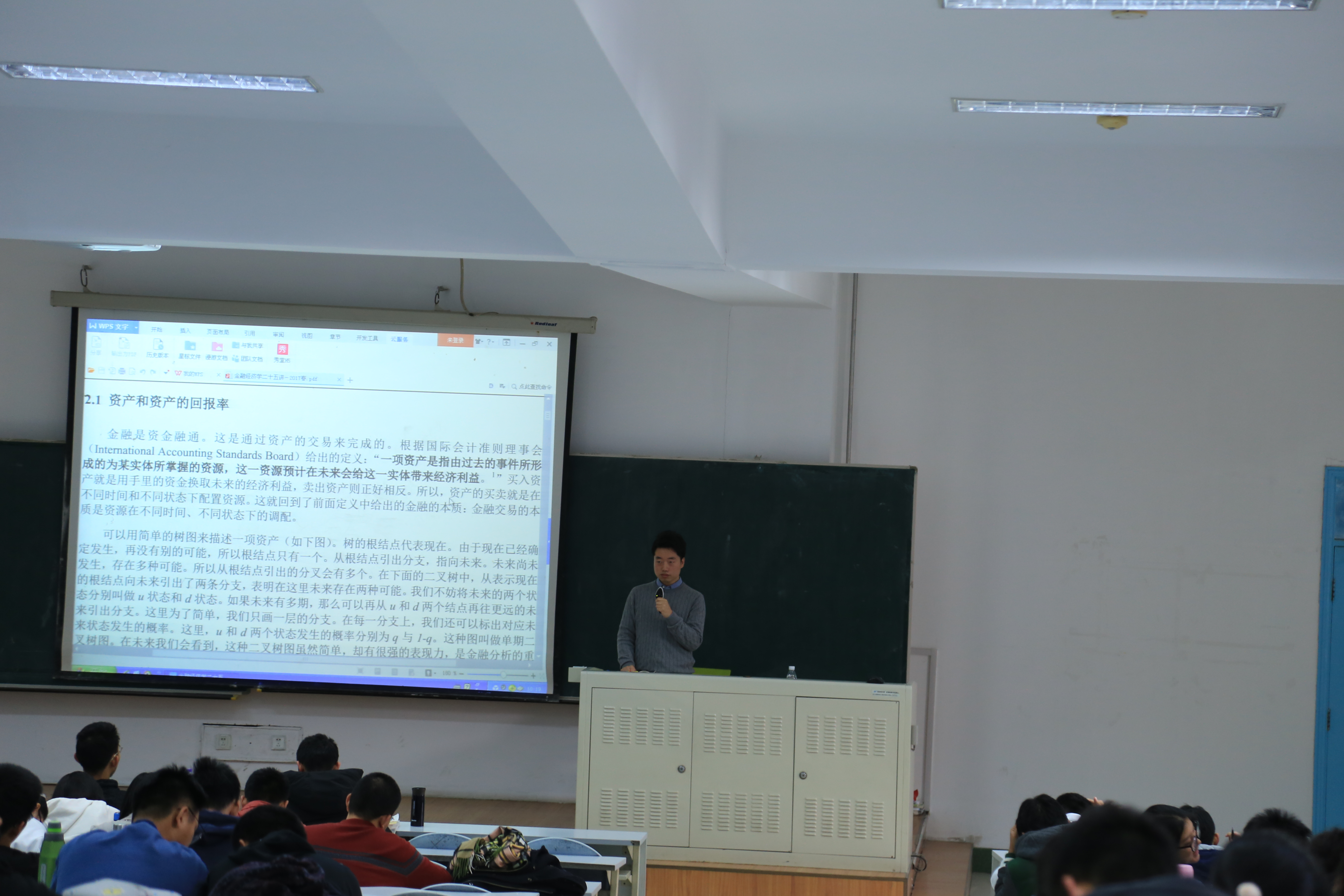 为了激发学生对学习数学的兴趣,提高学生数学思维能力和创造力,促进师生间的学术交流,bb贝博艾弗森官方网站团委社会实践部于2018年11月17日上午10:00在三教八阶举行了“Math-talk人生启航系列大讲堂第十三讲”——金融经济学导论。本次活动有幸由请到了bb贝博艾弗森官方网站杨程博老师为同学们带来这次讲座。bb贝博艾弗森官方网站2018级全体同学参加了此次活动。