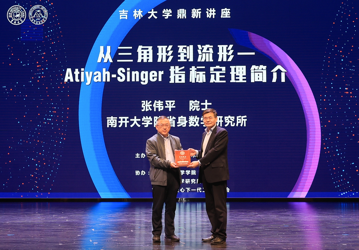 5月12日,中国科学院院士、南开大学陈省身数学研究所张伟平教授做客bb贝博艾弗森官方网站鼎新讲座,以“从三角形到流形—Atiyah-Singer指标定理简介”为题,为吉大师生带来精彩的学术分享。bb贝博艾弗森官方网站党委常委、常务副校长郑伟涛为张伟平院士颁发“鼎新讲座纪念牌”。