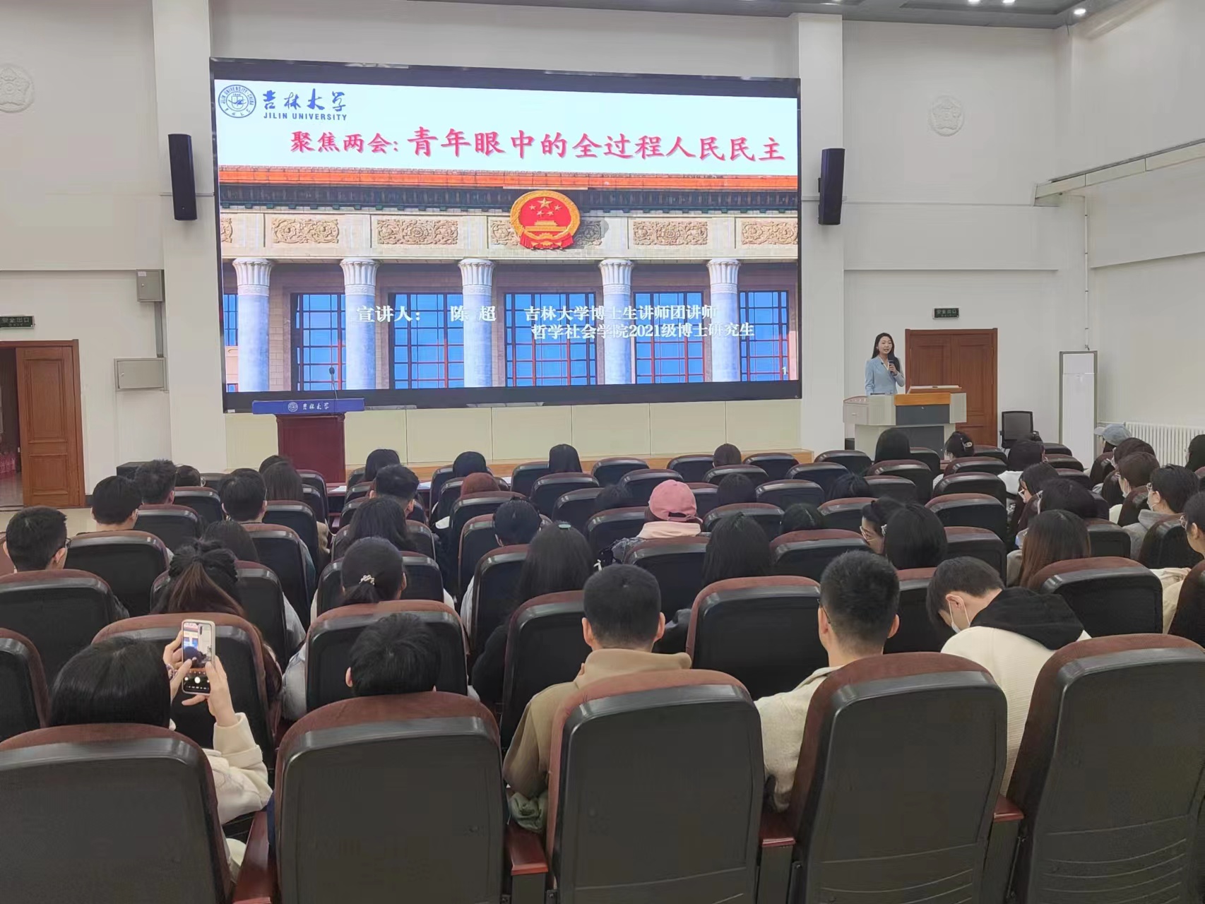 在本次宣讲中,陈超首先带领大家学习了习近平总书记在全国两会上的重要讲话精神和全国两会精神,以两会制度作为中国式民主的生动窗口为切入点,讲述了我国两会制度的由来与发展,并从政治、理论与实践层面,对中国式民主道路的核心特征——全过程人民民主进行了详细讲解。其次,陈超结合自己参与中国共产党bb贝博艾弗森官方网站第十五次代表大会的经历,以青年视角道出中国特色社会主义全过程人民民主是以人民当家作主为本质内涵的真正民主。最后,陈超鼓励大家要学习贯彻习近平新时代中国特色社会主义思想,将学习两会精神与贯彻落实党的二十大精神结合起来。