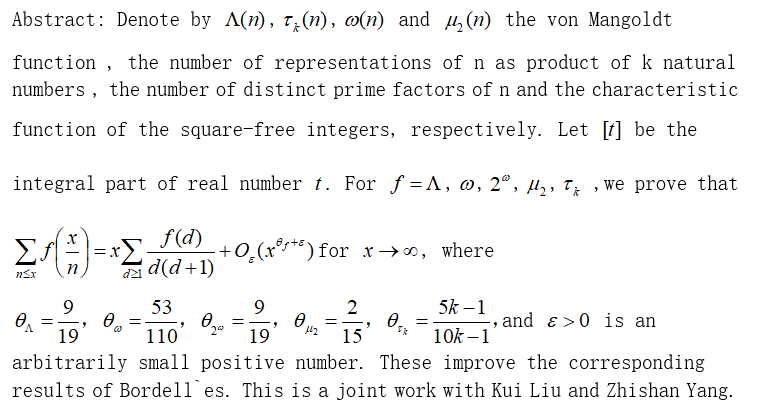 报告题目:ON SOME SUMS INVOLVING THE INTEGRAL PART FUNCTION
