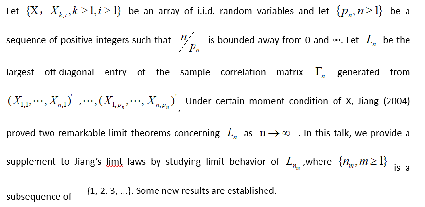 报告人简介:李德立,加拿大湖首大学(Lakehead Universit)y数学系教授(Tenured Full Professor of Statistics),主要研究方向是概率统计的极限定理及其应用、高维数据分析等,现已发表学术论文 100 余篇,多篇论文发表在The Annals of Probability、Probability Theory and Related Fields、The Annals of Applied Probability、Journal of Theoretical Probability等国际顶级期刊上。1983年9月至1986年6月, 师从吴智泉教授, 1986年7月获bb贝博艾弗森官方网站概率统计硕士学位;1992年1月至1994年8月师从Tomkins 教授, 1994年9月获加拿大Regina 大学概率统计博士学位。1989年李德立教授建立了B-值多指标独立随机变量和的重对数律的充分必要条件而获得中国国家教育委员会科学技术进步二等奖。李德立教授的研究已六次获得加拿大自然科学和工程研究基金的有力资助,而且获得加拿大湖首大学授予的2009年加拿大自然科学和工程研究基金杰出研究奖。