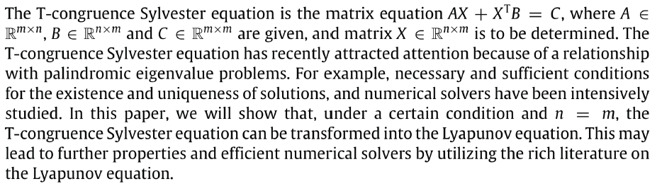 报告题目:Relationship between T-congruence Sylvester equation and Lyapunov equation