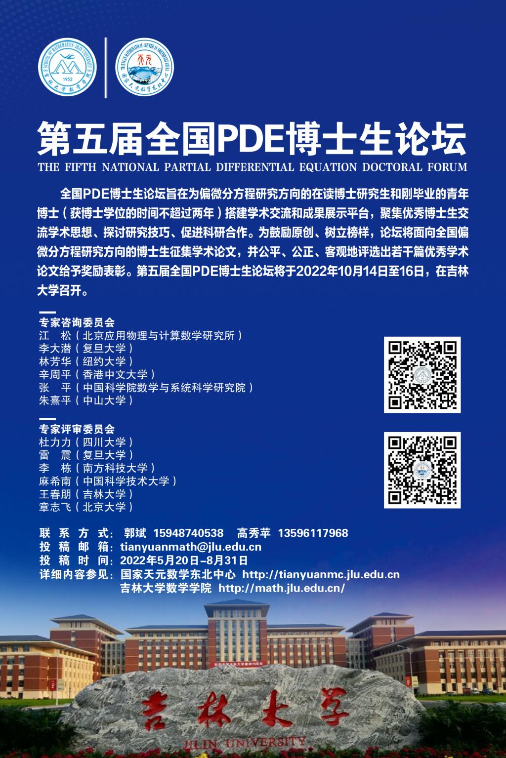 全国PDE博士生论坛已成功举办四届:复旦大学(第一届,2018年11月)、北京大学(第二届,2019年10月)、中国科学技术大学(第三届,2020年11月)、厦门大学(第四届,2022年4月),bb贝博艾弗森官方网站将于2022年10月14日至16日举办“第五届全国PDE博士生论坛”,我们诚挚地邀请全国偏微分方程方向的博士生及青年博士参加本次论坛。