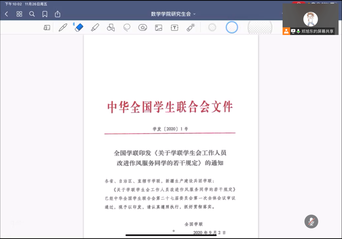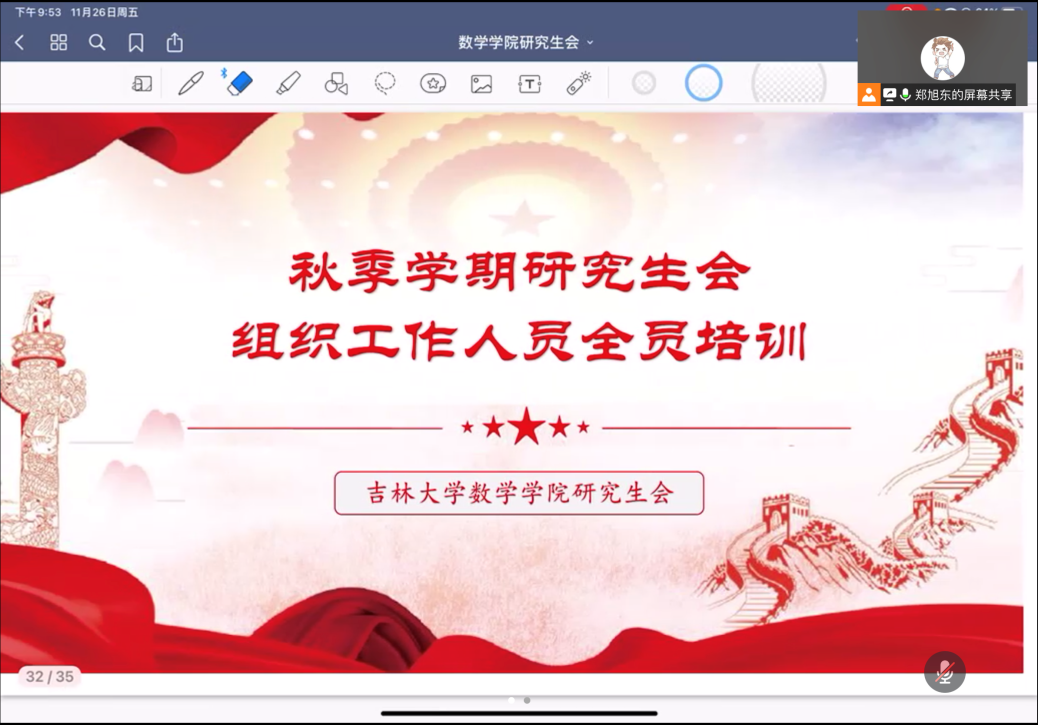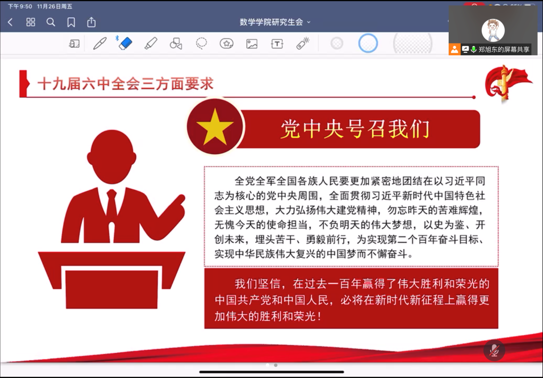 为进一步加强我院研究生会队伍建设,切实发挥学生骨干在“自我管理、自我教育、自我服务”中的作用,培养和选拔一支“政治素质过硬、服务意识突出、工作态度优异、业务素质精湛”的研究生会工作人员队伍,11月26日,bb贝博艾弗森官方网站研究生会于线上举办了2021-2022学年秋季学期研究生会组织工作人员全员培训会暨党的十九届六中全会精神学习研讨会,学院研究生会执行主席郑旭东主持会议,学院研究生会全体成员出席会议。
