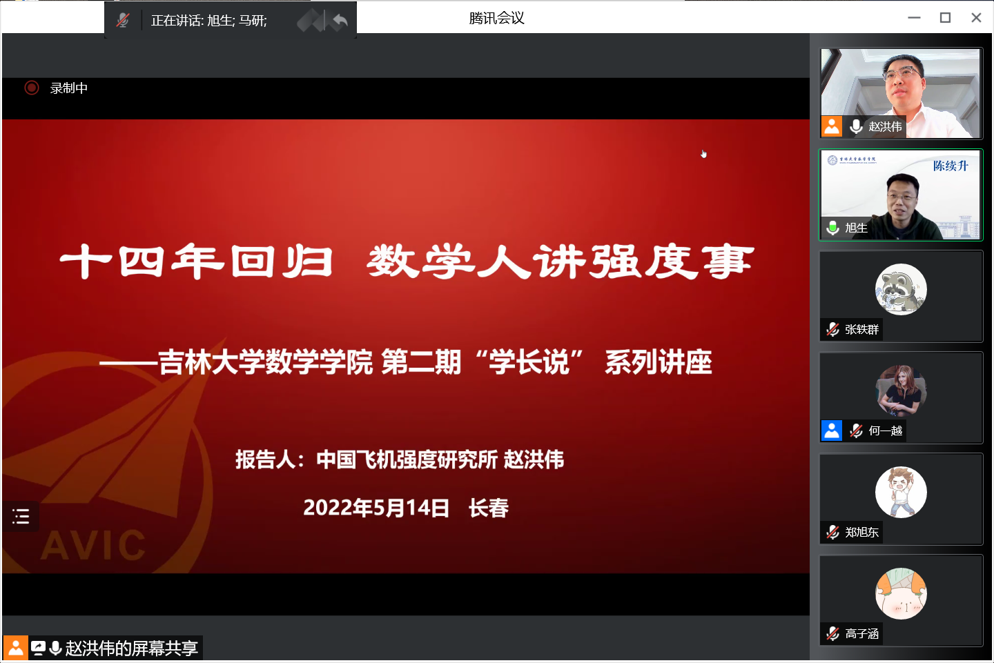 为做好研究生就业创业引导工作,帮助学生树立正确的就业观、择业观、成才观,bb贝博艾弗森官方网站研究生“学长说”系列活动第二期之“十四年回归 数学人讲强度事”于2022年5月14日18时成功举办。本次活动特邀嘉宾为中国飞机强度研究所的赵洪伟老师。bb贝博艾弗森官方网站党委副书记陈续升参加会议并致辞。