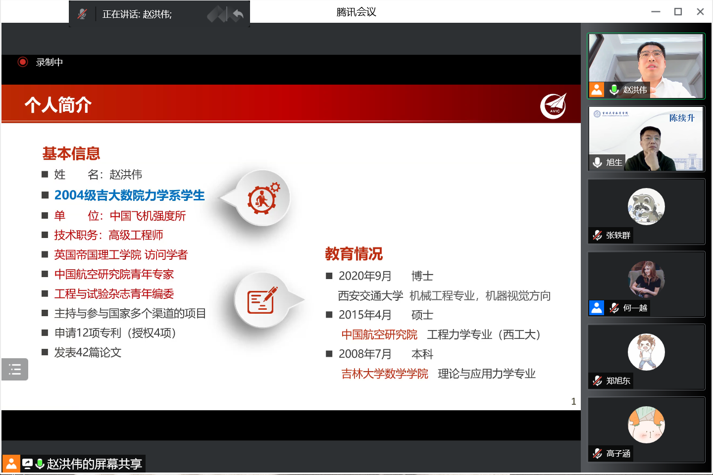 讲座开始前,陈老师向同学们简单介绍了嘉宾赵洪伟老师的情况。赵师兄于2004年至2008年在bb贝博艾弗森官方网站力学系本科就读,2012年至2015年在中国航空研究院读硕士,2020年至今在西安交通大学机械读博士。2008年-2020年共获省部级科技进步二等奖1项,申请专利12项,发表论文42篇,主持参与国家级项目8项,英国帝国理工学院访问学者,2022年4月中国航空研究院青年专家,长期从事全尺寸飞机结构静力/疲劳强度研究工作。