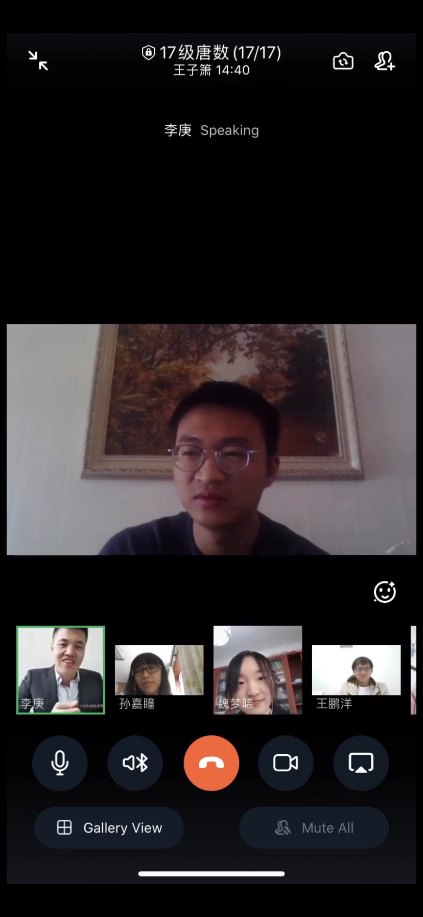 本次出席人员有2017级唐敖庆班全体同学和辅导员李庚。首先,李庚老师向大家说明了学校防疫工作的各项措施,强调了学校对同学们居家防疫的要求。接着,李庚老师与大家共勉了习主席写给北京大学援鄂医疗队全体“90党员的回信。信中说青年一代有理想、有本领、有担当,国家就有前途,民族就有希望,深深鼓舞了班级的同学,同学们都纷纷分享自己身边经历过或者听说过的感人事迹,如自己的高中同学作为青年志愿者参与社区服务工作,驰援湖北的4.2万医护人员中有1.2万是90后、00后。