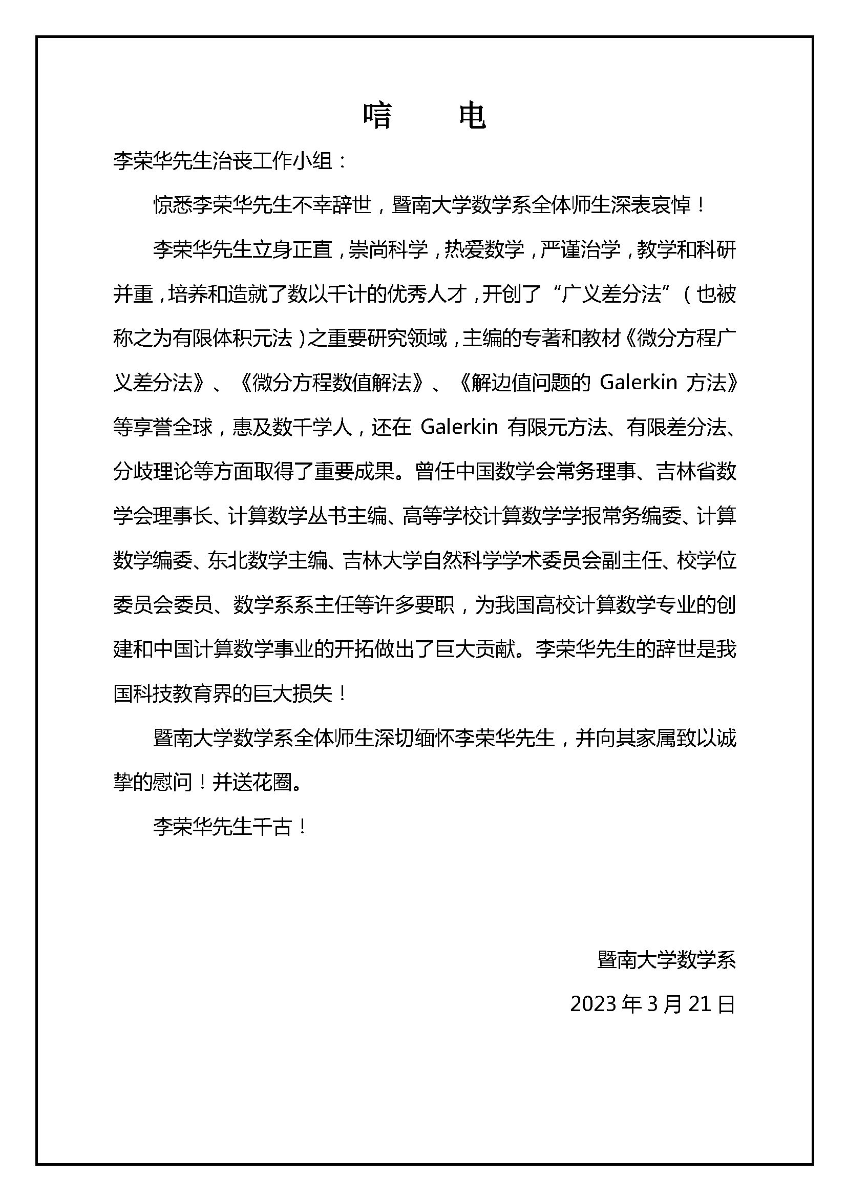 暨南大学数学系唁电