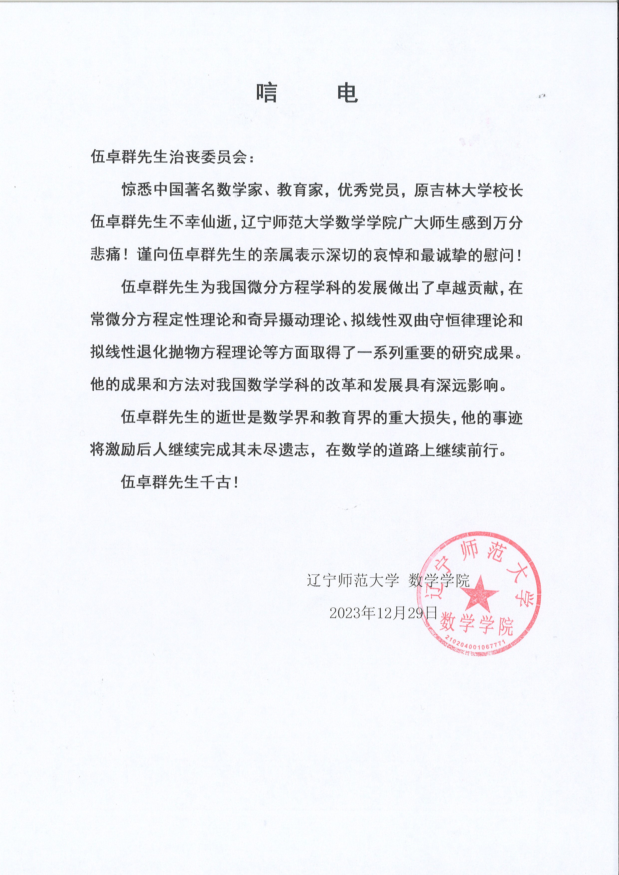 吉林省数学会唁电