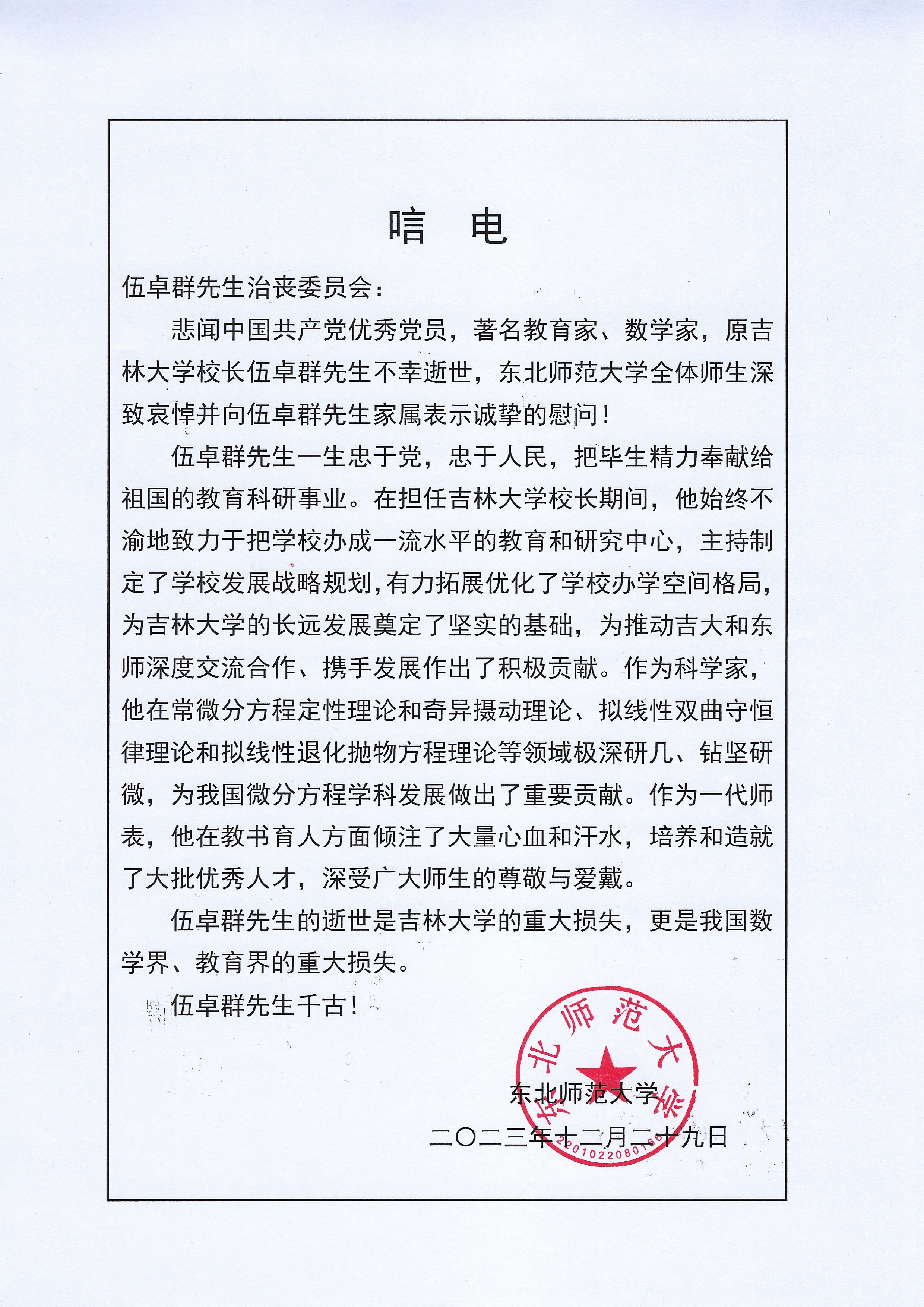 东北师范大学唁电