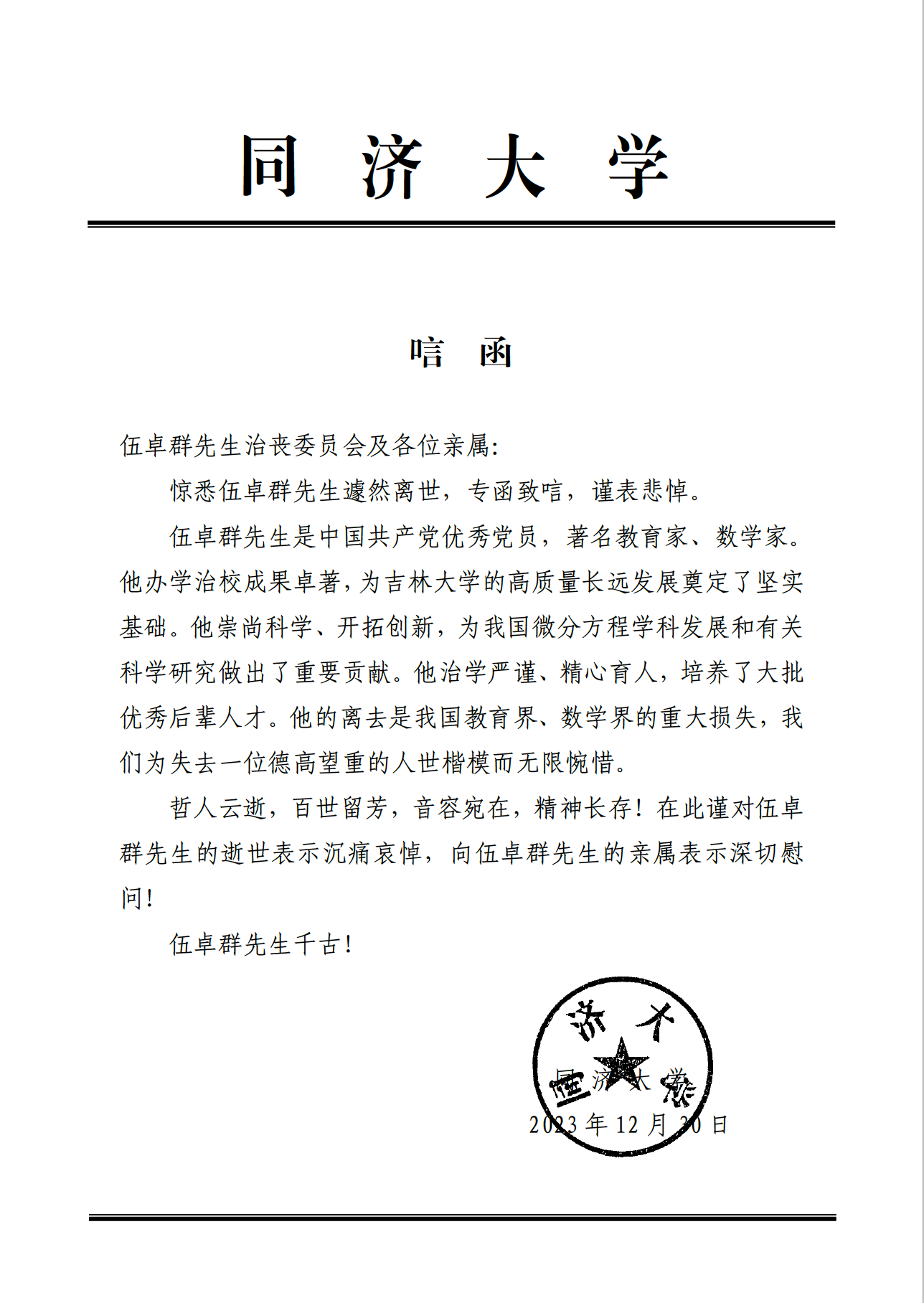同济大学唁函